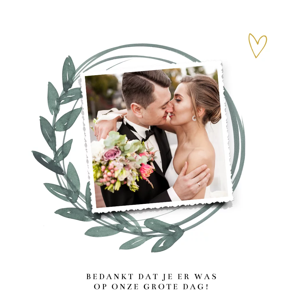 Sierlijke bedankkaart om na afloop van jullie mooie bruiloft te sturen aan vrienden en familie. Leuk om een foto toe voegen van jullie samen. Mooi versierd met takjes en hartje.
