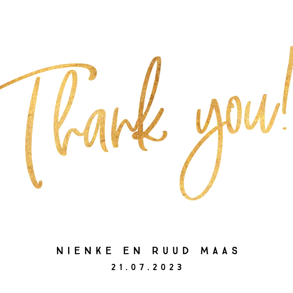 Cleane maar stijlvolle bedankkaart trouwen met sierlijke goudlook letters. Bedank al jullie gasten met deze mooi kaart. Tip! Mooi met een parelmoeren envelop en bijpassende sluitzegel.