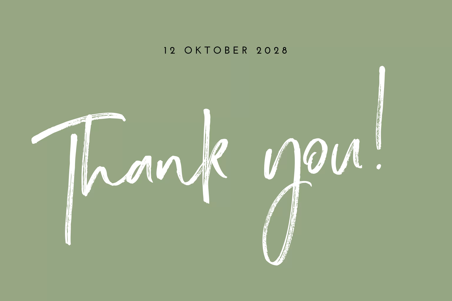Bedankkaart trouwen met een clean ontwerp en een speels lettertype. Het lettertype en achtergrondkleur is geheel naar wens aanpasbaar. Maak de bedankkaart helemaal eigen en maak het af met een bijpassende kleur envelop.