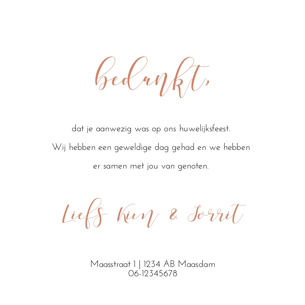 Less is more! Bedankkaart trouwen met een eenvoudig maar stijlvol ontwerp en een sierlijk lettertype. Het lettertype en kleur is geheel naar wens aanpasbaar. Maak de bedankkaart helemaal eigen en maak het af met een bijpassende kleur envelop.