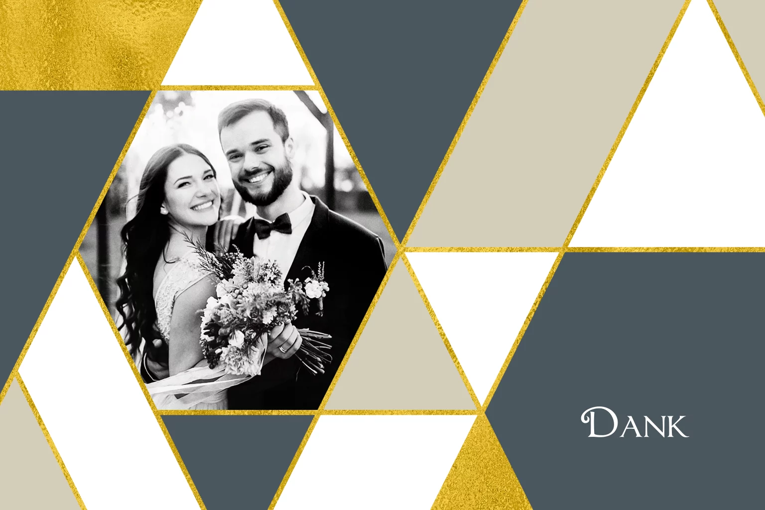 Prachtige bedankkaart trouwen met ruiten, goudlook details en je eigen foto van de speciale dag. Zowel met kleuren als zwart wit foto mooi! Naast deze bedankkaart hebben wij ook een bijpassende trouwkaart en save the date kaart.