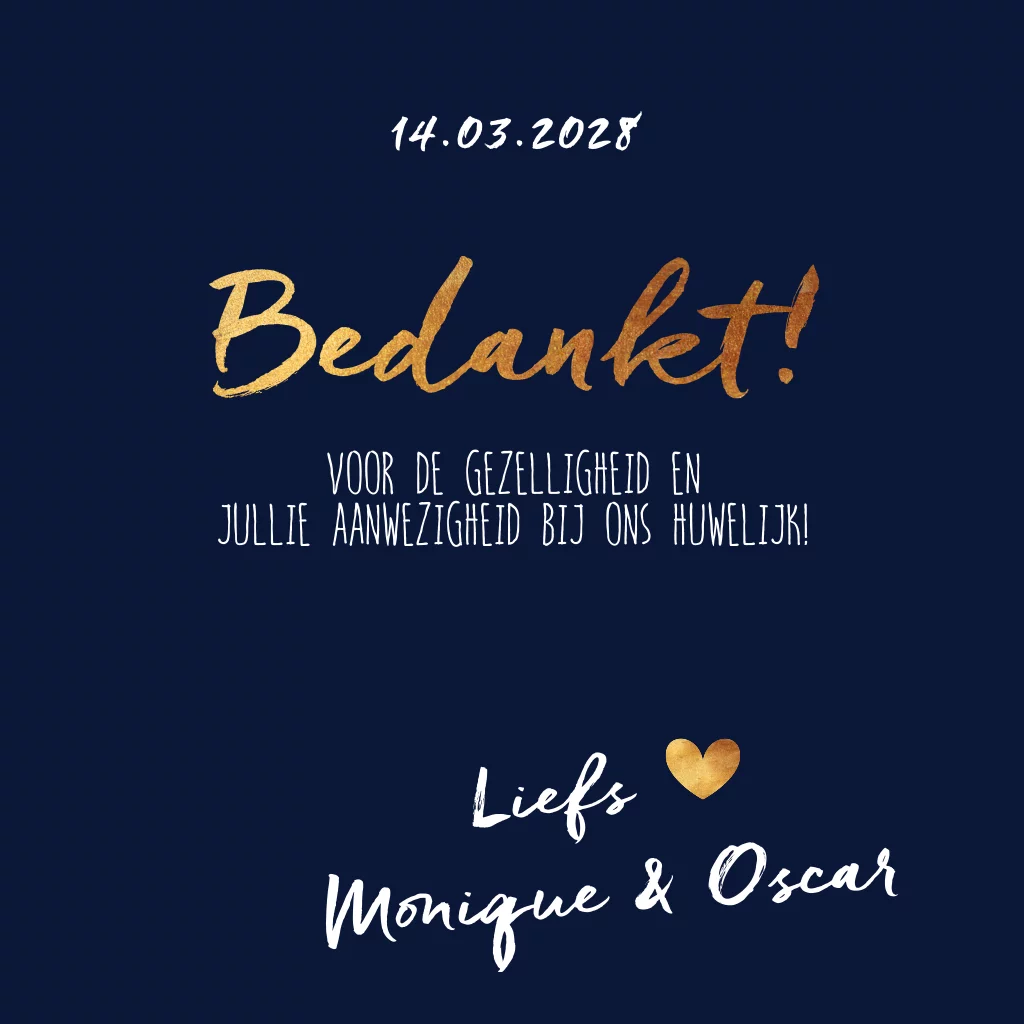 Bedankkaart met prachtige gouden letters en hartjes! Een feestelijke manier om al jullie dierbaren te bedanken voor die mooie en bijzondere dag!