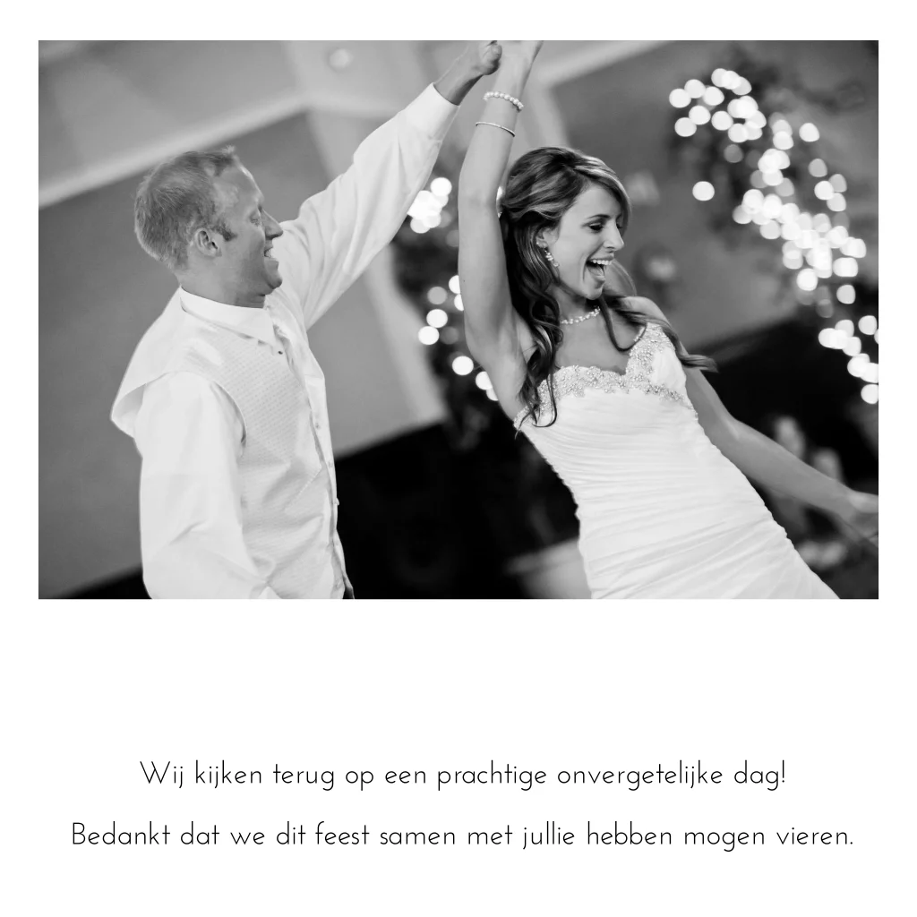 Zwart witte bedankkaart die je naar vrienden en familie kunt versturen. Gaaf met een foto van jullie speciale dag. Mooi ook met een bijpassende envelop en sluitzegel.