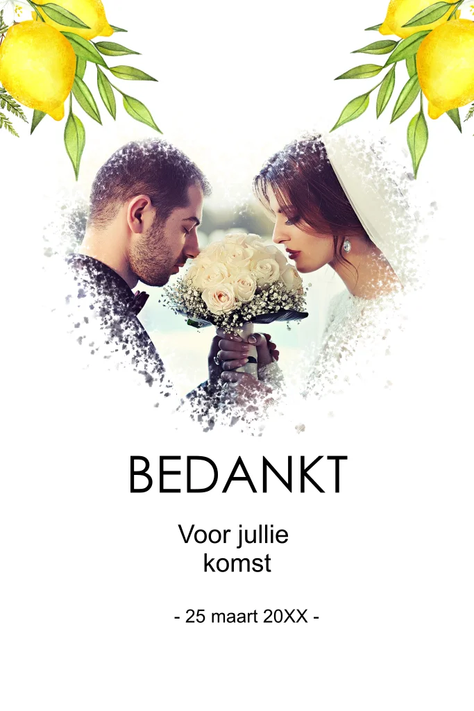 Bedankt voor trouwen met botanische citroen en blad met kader van hart voor jouw foto.