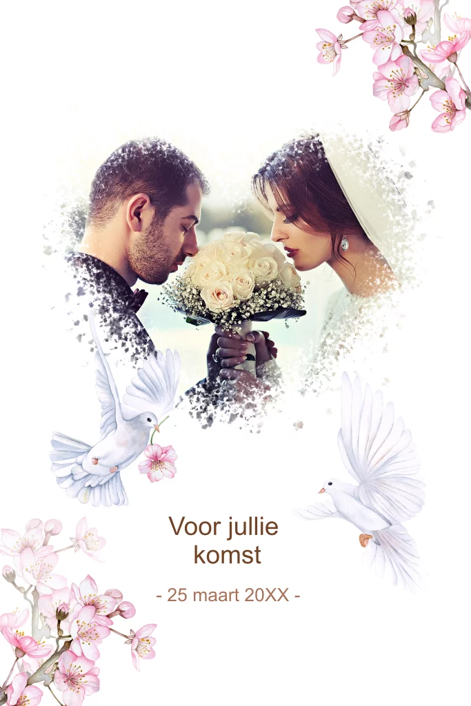 Bedankt voor trouwen met witte duiven en roze bloesem en hart voor jouw foto.
