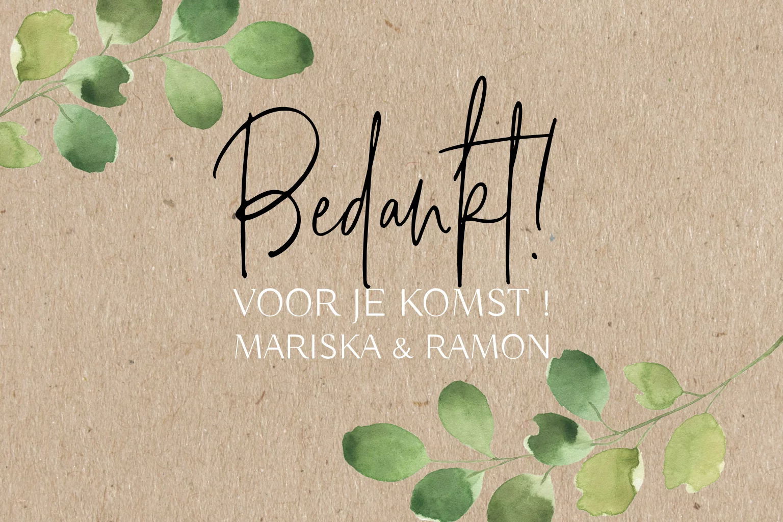 Stijlvolle bedankkaart met takjes en bladeren op een kraft look achtergrond. Bedank als jullie bruiloftsgasten met deze mooie kaart. Tip! Wanneer je deze afdrukt op Oud Hollands papier geeft dat een mooie structuur.