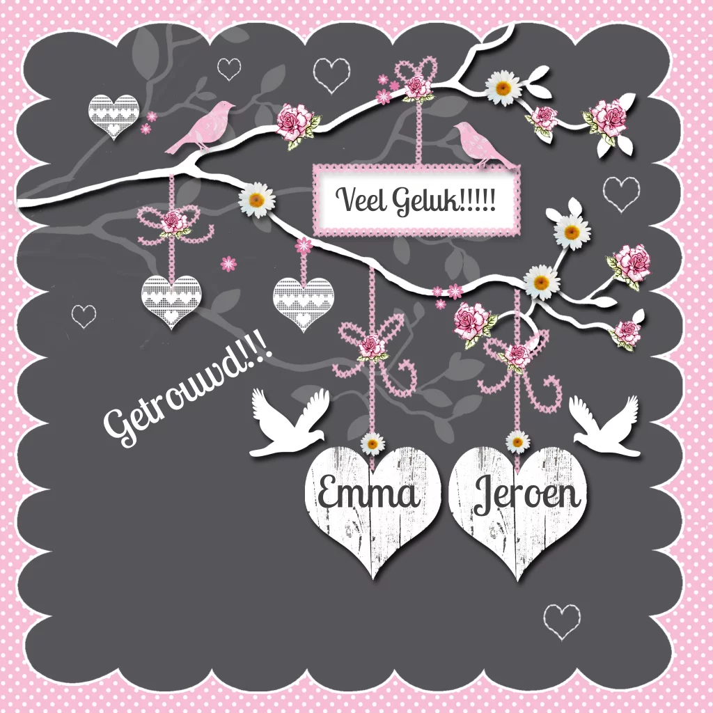 Felicitatiekaartje voor een pas getrouwd stel met een stukje boom met hartjes eraan!