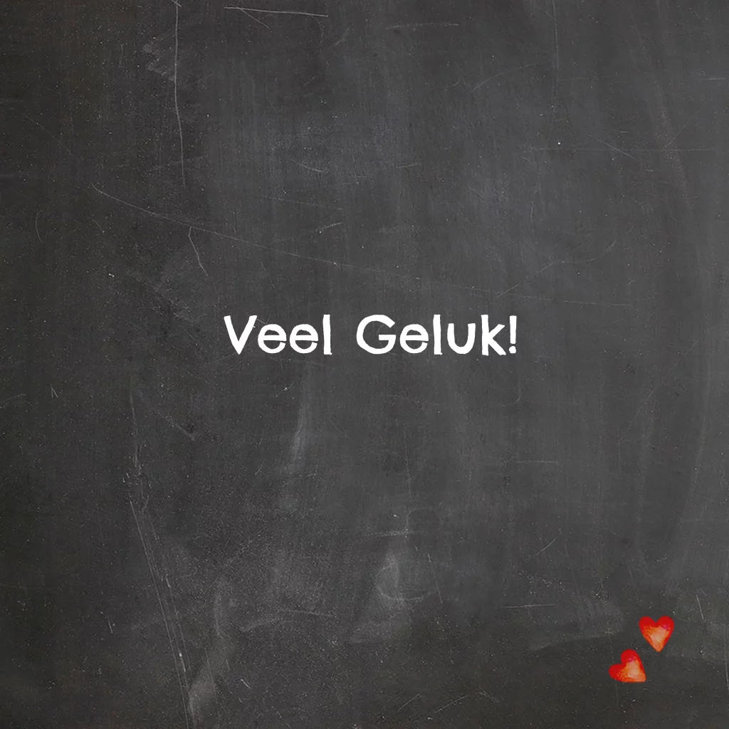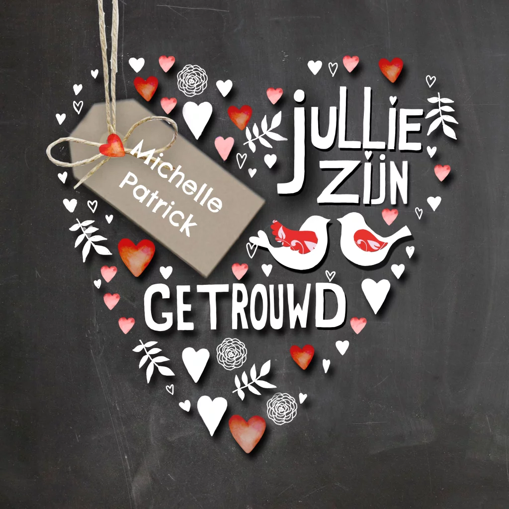 Mooie felicitatiekaart met de tekst; jullie zijn getrouwd erop. Ook zijn er in deze kaart allemaal romatische figuren verwerkt op een schoolbord.
