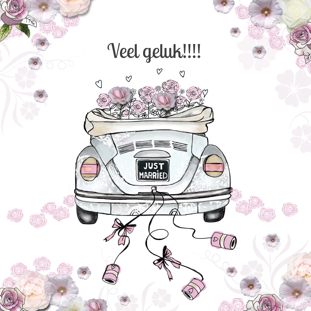 Felicitatiekaart met een kever en bloemen voor een pas getrouwd stel.