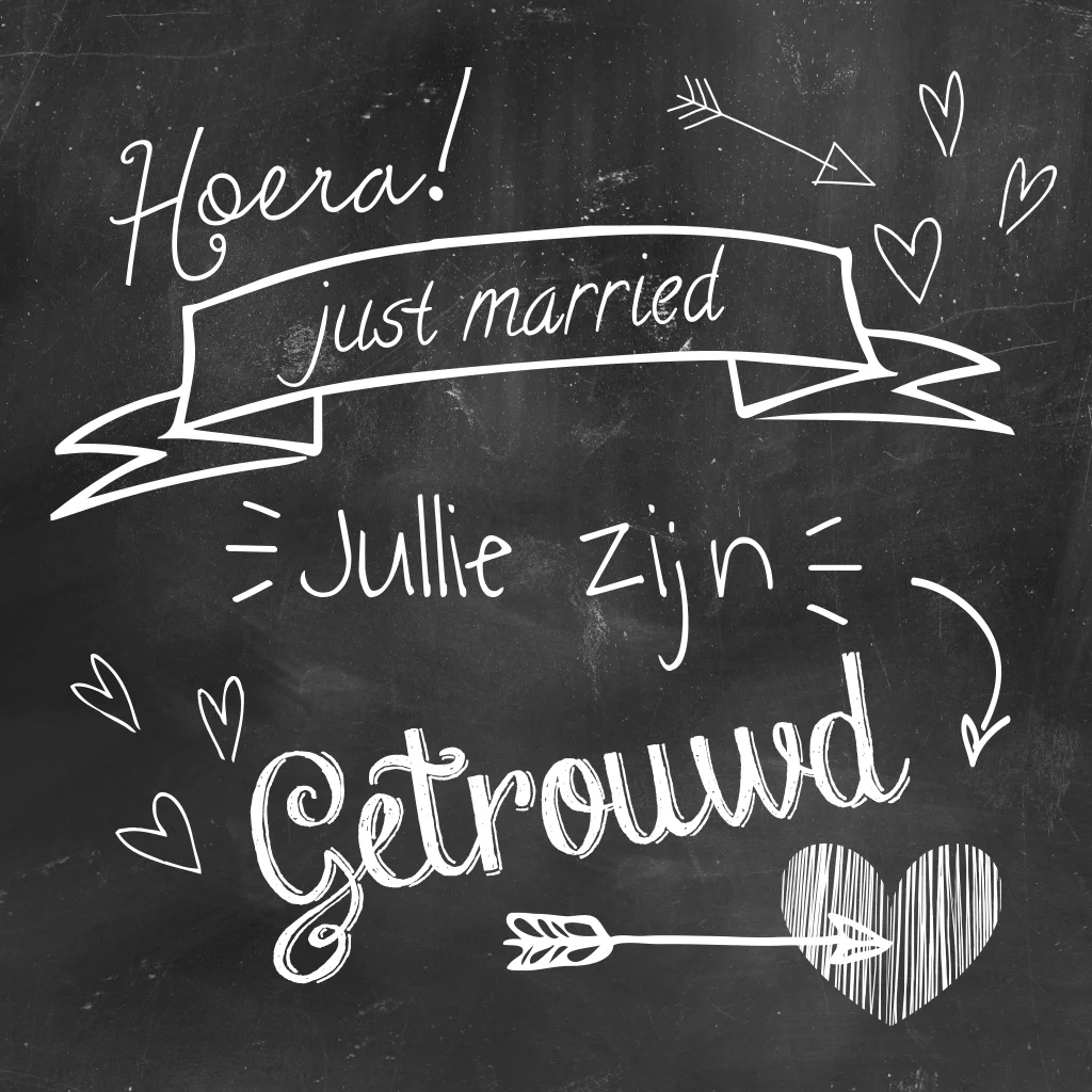Stoere wenskaart in grafisch krijtbord met de tekst: Hoera just married. De tekst op de voorkant van deze kaart is in zijn geheel aanpasbaar in zowel tekst, kleur, lettertype als lettergrootte.