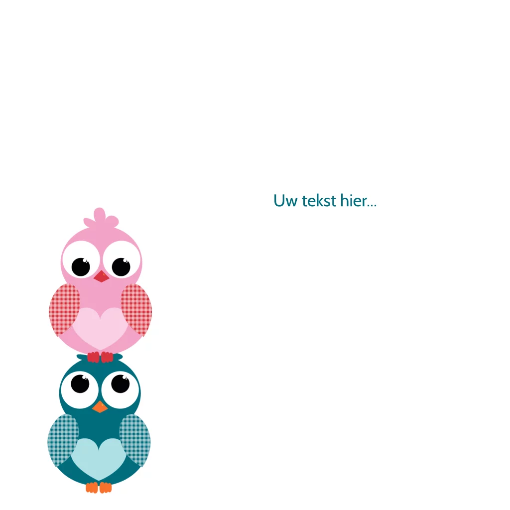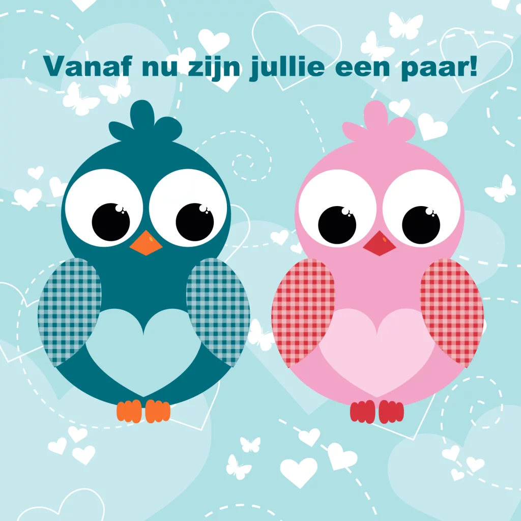 Wat een grappige vogeltjes! Samen met de achtergrond van hartjes en vlindertjes is het een geschikte kaart voor het stel dat gaat trouwen.