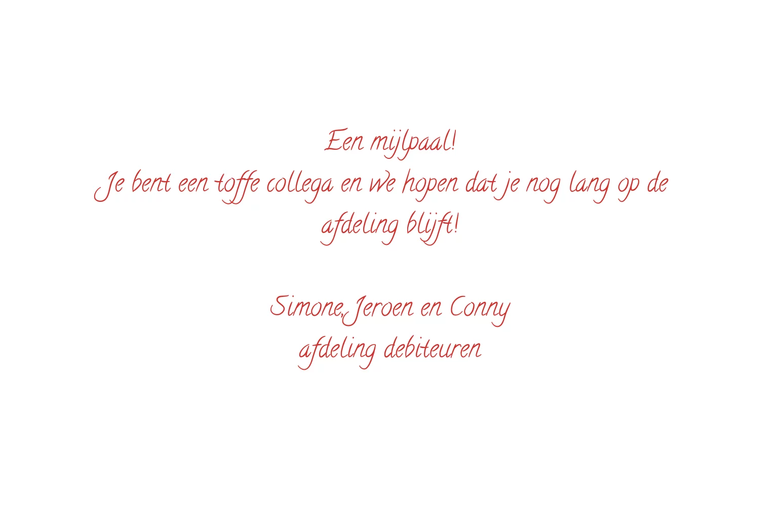 Vijftien jaar in dienst is echt een mijlpaal. Laat dit niet zomaar voorbij gaan en stuur een toepasselijke wenskaart. De teksten aan de binnen- en buitenkant zijn eenvoudig aan te passen.
