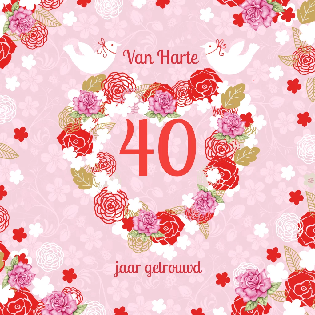 Felicitatiekaart voor een huwelijksjubileum met bloemen, hart en duiven.