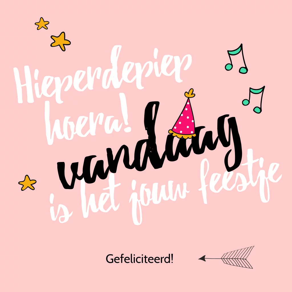 Vrolijk felicitatiekaartje in frisse roze kleur met speelse typografie en elementen.