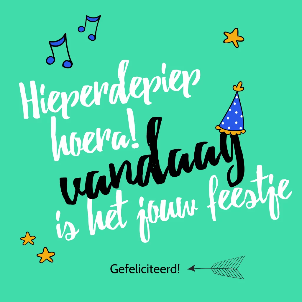 Leuke kinderverjaardagskaart in hippe kleur en met vrolijke elementen zoals muzieknoten, sterretjes en feestmutsje.