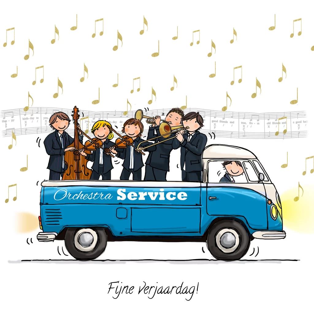 Verjaardagskaart met orchestra orkest in Volkswagen
