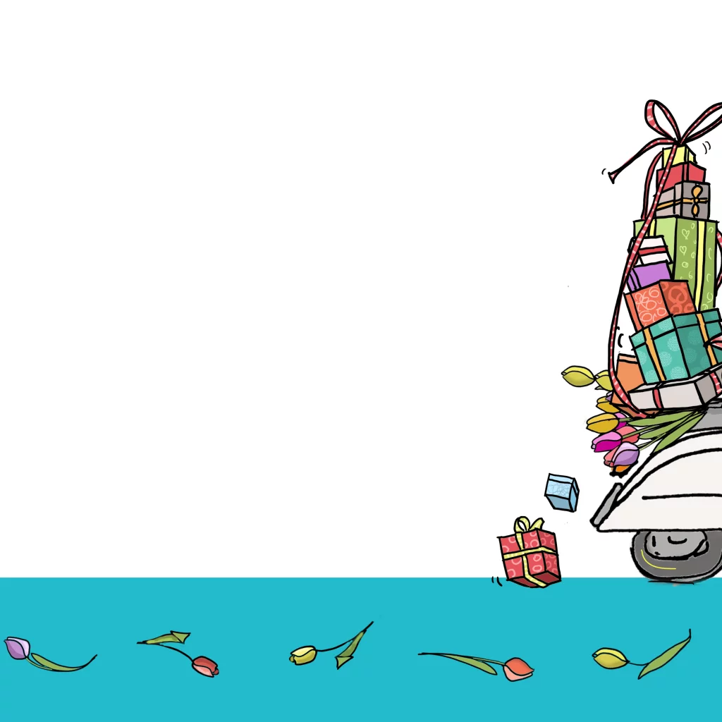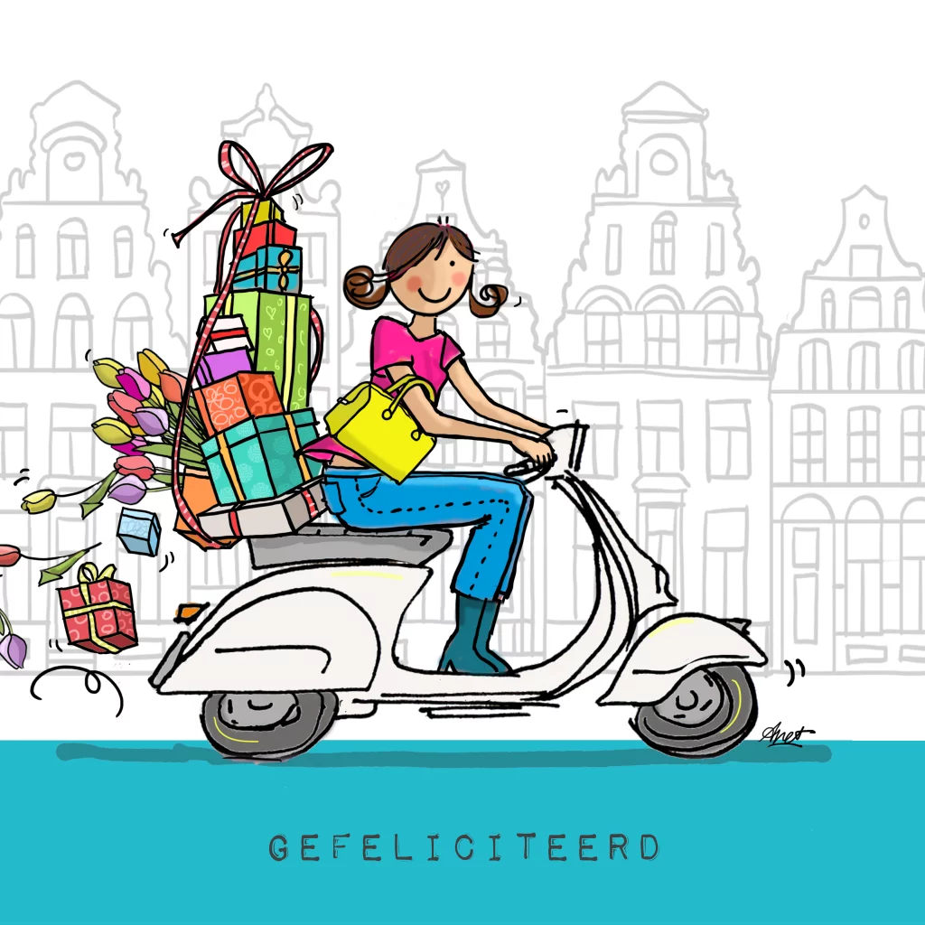 Aan wie stuur jij deze getekende verjaardagskaart van Anet Illustraties? De kaart bevat een tekening van een witte Vespa Scooter, cadeaus, tulpen en op de achtergrond bevinden zich mooie statige huizen.