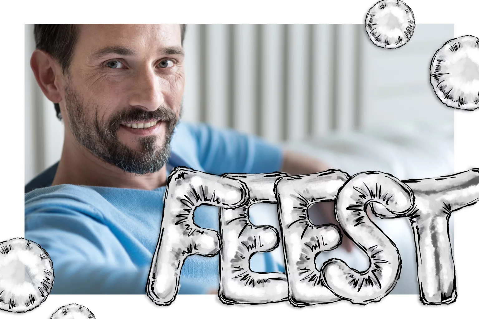 Een vrolijke fotokaart met een fotolijst van ballonnen. Deze getekende ballonnen vormen het woord FEEST. En dat pas natuurlijk perfect bij een verjaardagsparty! Mooi met een zilveren envelop.
