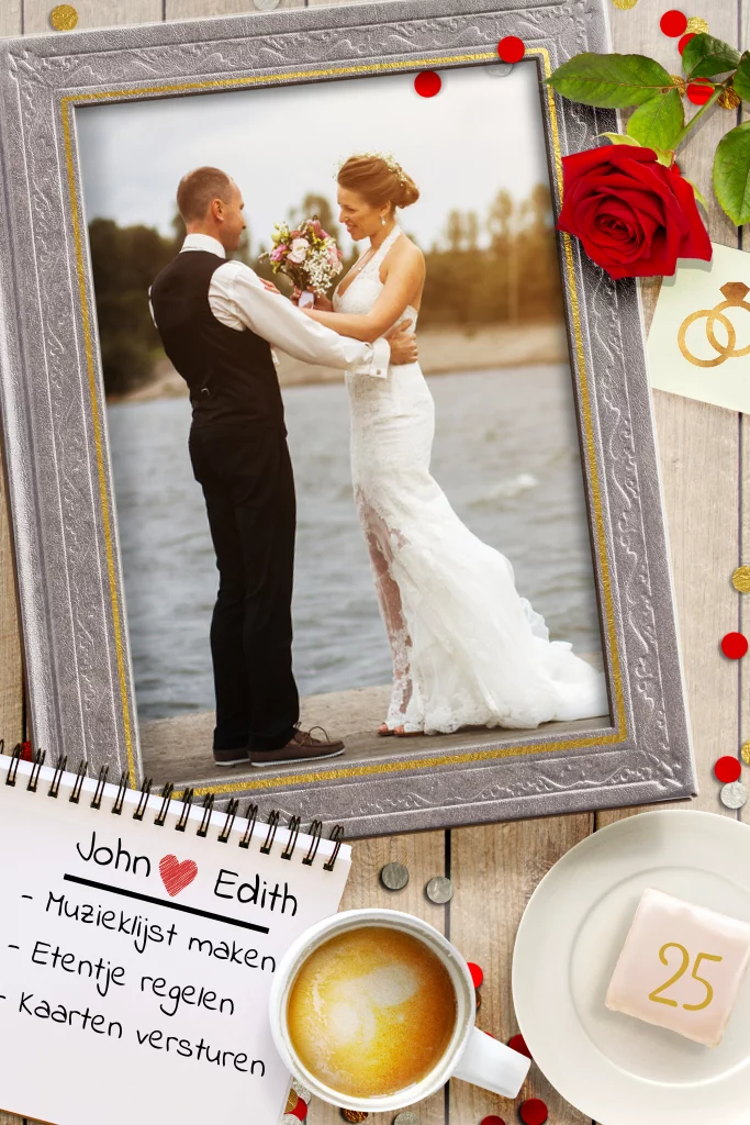 Originele uitnodiging voor jullie 25 jarig huwelijksjubileum. Deze kaart is extra persoonlijk door de toevoeging van de foto van jullie bruiloft destijds. En feestelijk door de confetti. Maak het af door te kiezen voor een gouden of rode envelop.