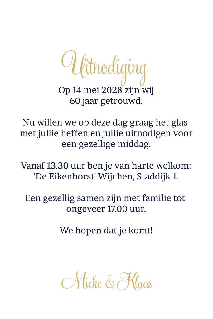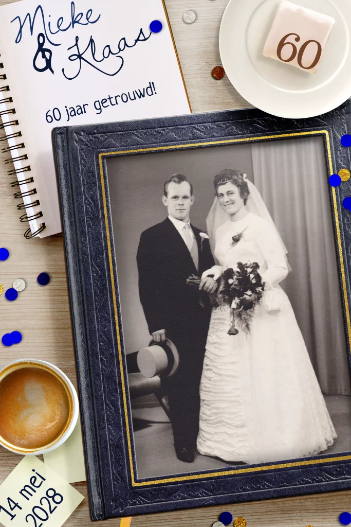Originele persoonlijke uitnodiging voor jullie 60 jarig huwelijksjubileum. Deze kaart is extra persoonlijk door de toevoeging van de foto van jullie samen destijds. En feestelijk door de confetti. Maak het af door te kiezen voor een gouden of blauwe envelop.
