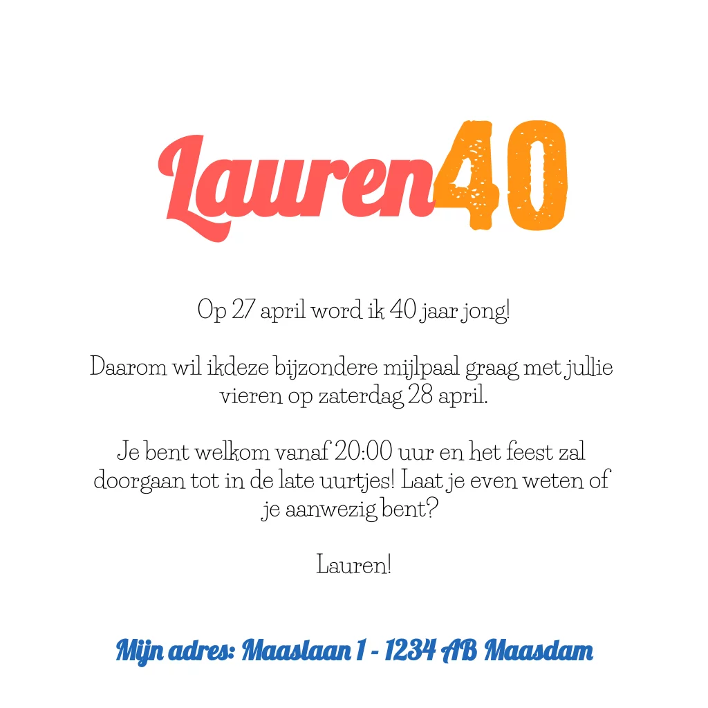Vier je 40e feestje met origineel themafeestje en kies voor een gezellige Hollandse avond. Deze uitnodiging past perfect bij het thema door de Hollandse kleuren, tulpen en oranje kroontje! Maak het af met een oranje envelop.