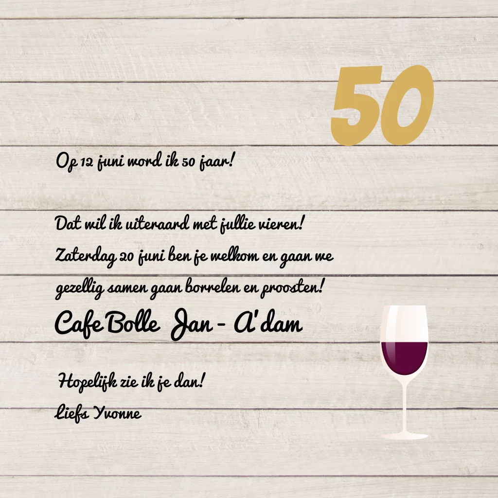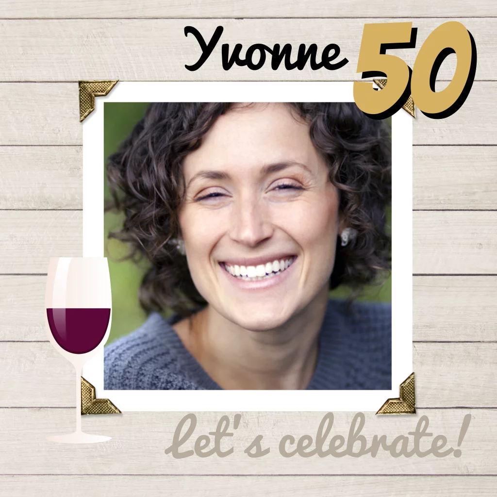 Let's Celebrate! Proost op jouw 50e verjaardag. Nodig vrienden en familie uit met deze leuke uitnodiging. Mooie houten fotokader en geïllustreerd met een gezellig wijntje en verschillende lettertypes.