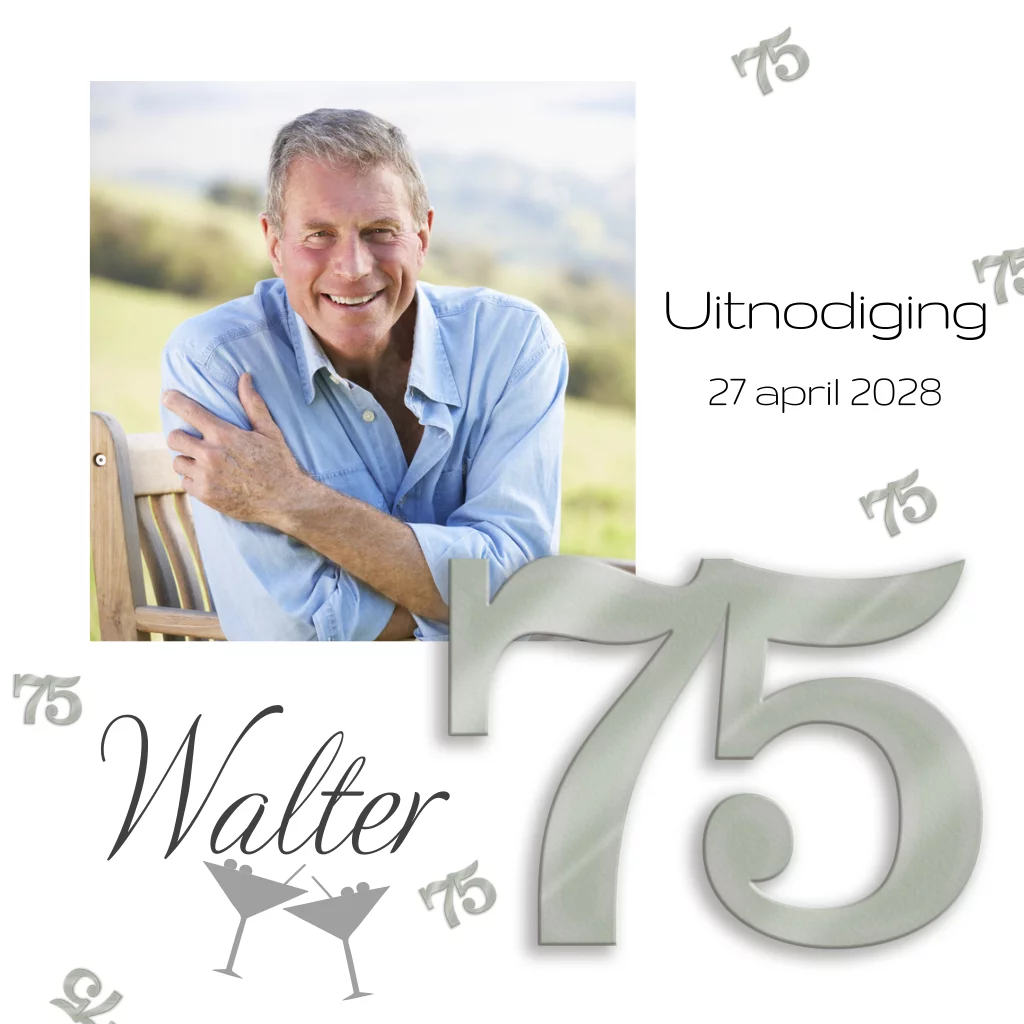 Uitnodiging 75 jaar met zilveren elementjes en foto