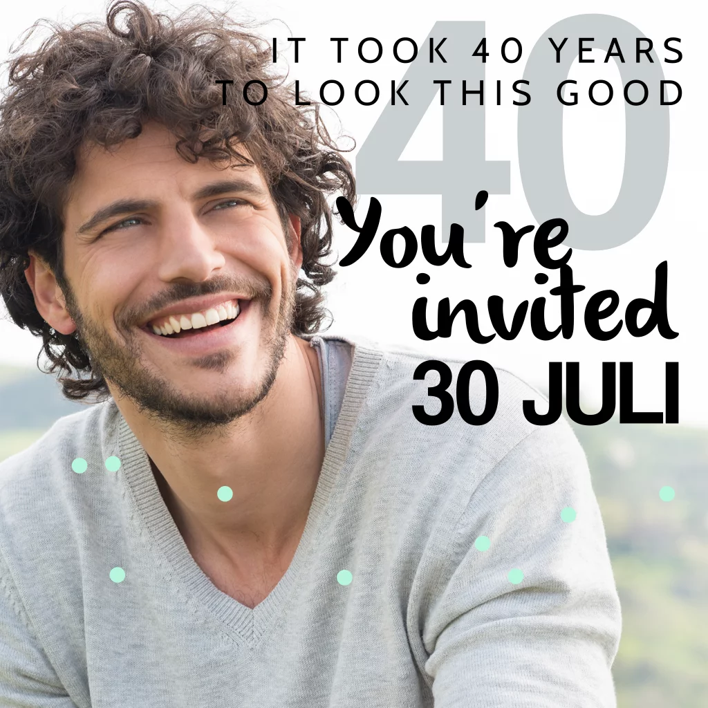 Strakke maar feestelijke uitnodiging voor een 40e verjaardag. It took 40 years to look this good, dus vier deze mijlpaal! Witte kaart met mintgroene stippen . Proost op jouw levenservaring! Tof met mintgroene envelop.