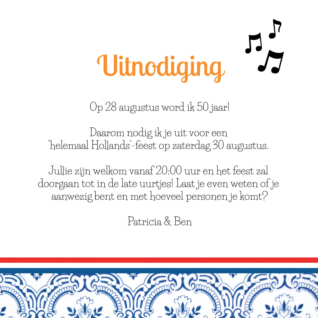 De Hollandse avond! Vier je 50e verjaardag met een themafeest en kies voor een lekker Nederlands feestje. Deze uitnodiging past hier perfect bij. Oranje kader en Delfts blauwe accenten.