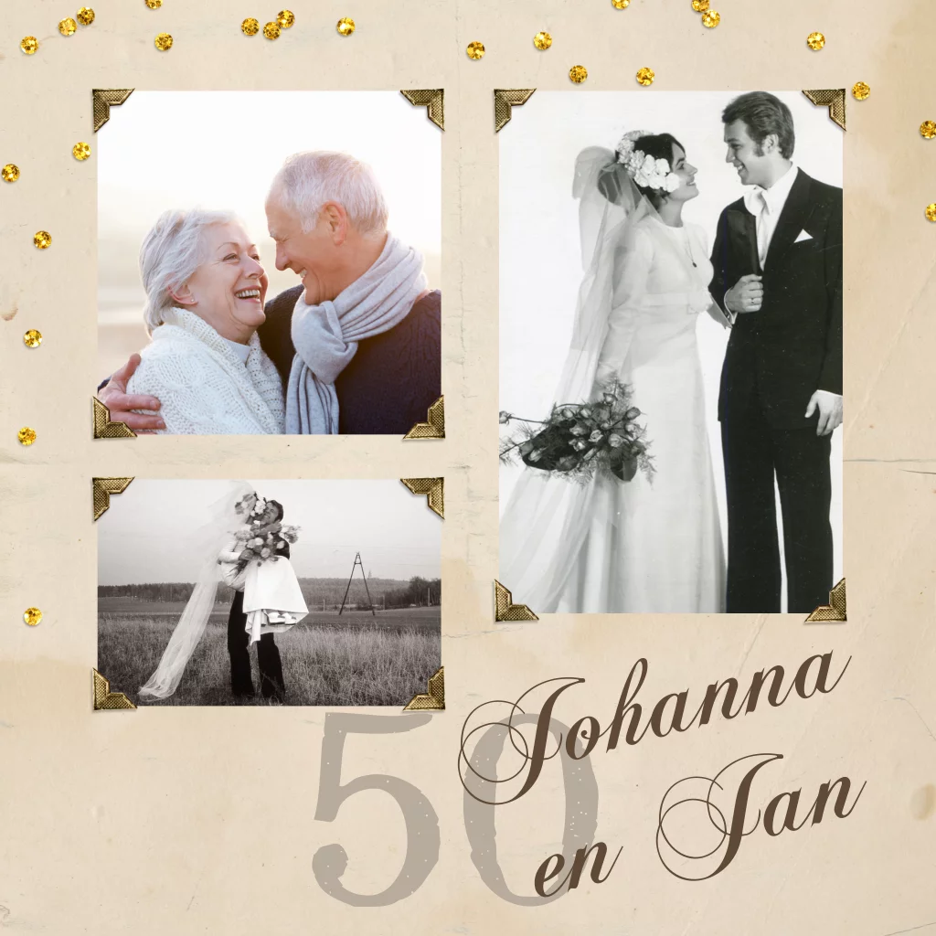 Uitnodiging voor jullie vijftig jarig huwelijksfeest. Deze kaart met gouden confetti is extra persoonlijk door de ruimte die is gemaakt van foto's van jullie samen.