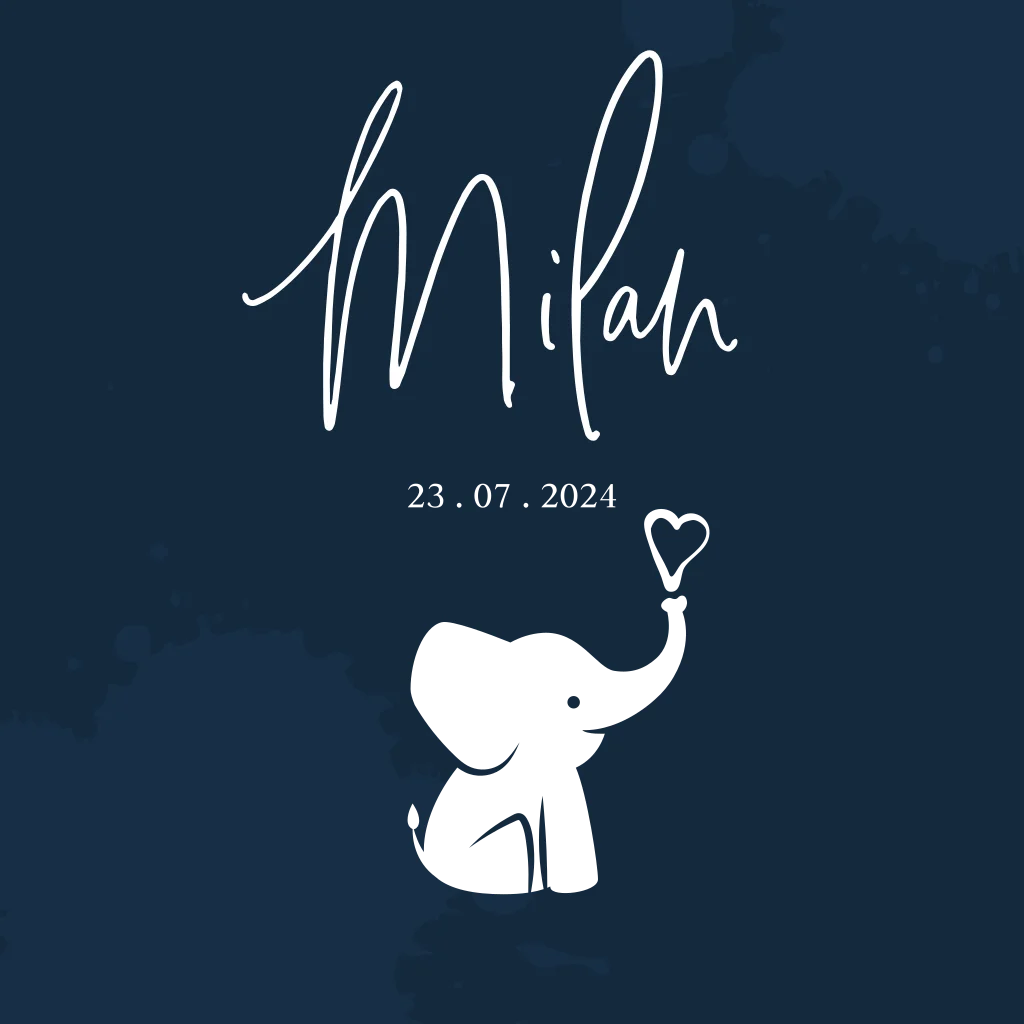 "Hip en stoer geboortekaartje met silhouet van een olifantje in goudfolie. Kies een donkere achtergrond om de naam van jullie kindje er extra uit te laten springen.