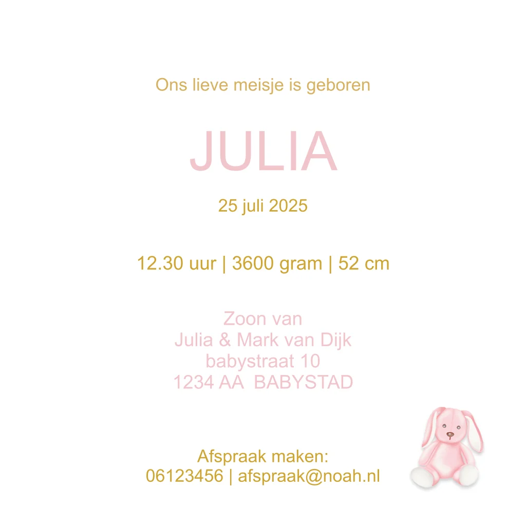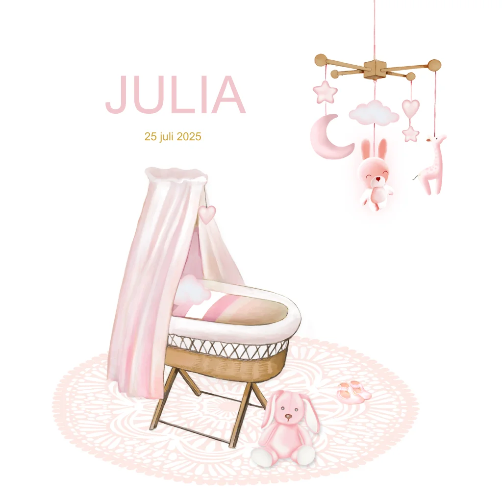 Verwelkom je kleine wonder met dit schattige geboortekaartje, een Wiegje met Mobiel en versierd met een lief konijntje dat perfect past bij de komst van jullie pasgeboren meisje.