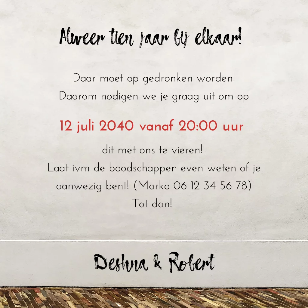 10 jaar bij elkaar en het huwelijksbootje drijft nog! Dat moet gevierd worden! Stuur al je favo mensen deze kaart om te laten weten wanneer jullie dit vieren!
