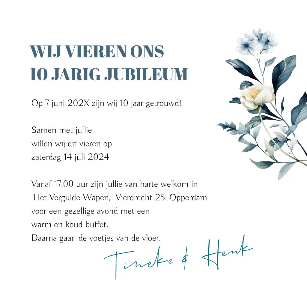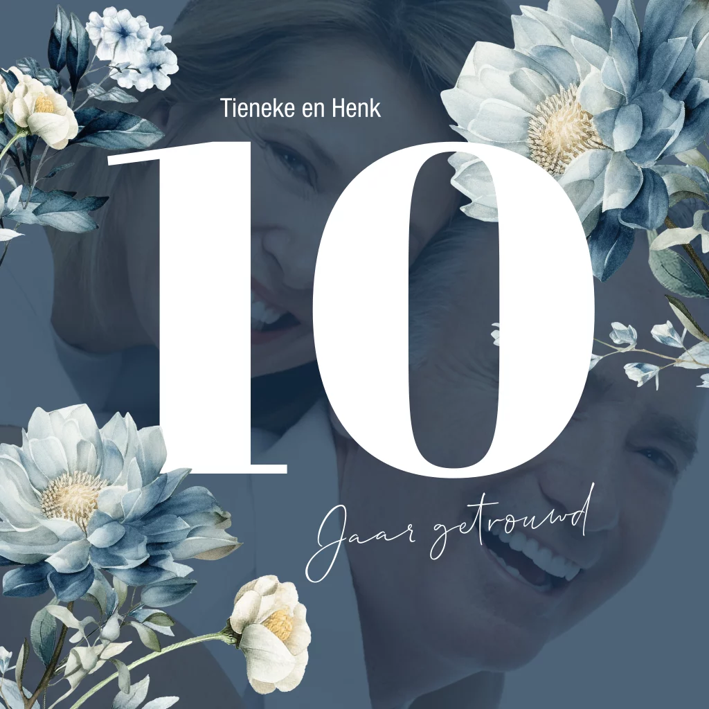 Vier 10 jaar samenzijn met deze prachtige jubileumuitnodiging Romantic Botanic Blue. Voeg eenvoudig een persoonlijke touch toe met jullie eigen foto's.