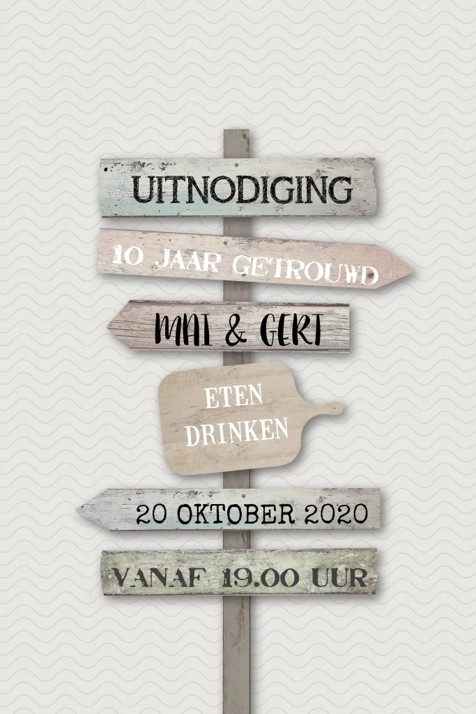 Uitnodigingskaart voor 10 jaar samen feest met wegwijzers