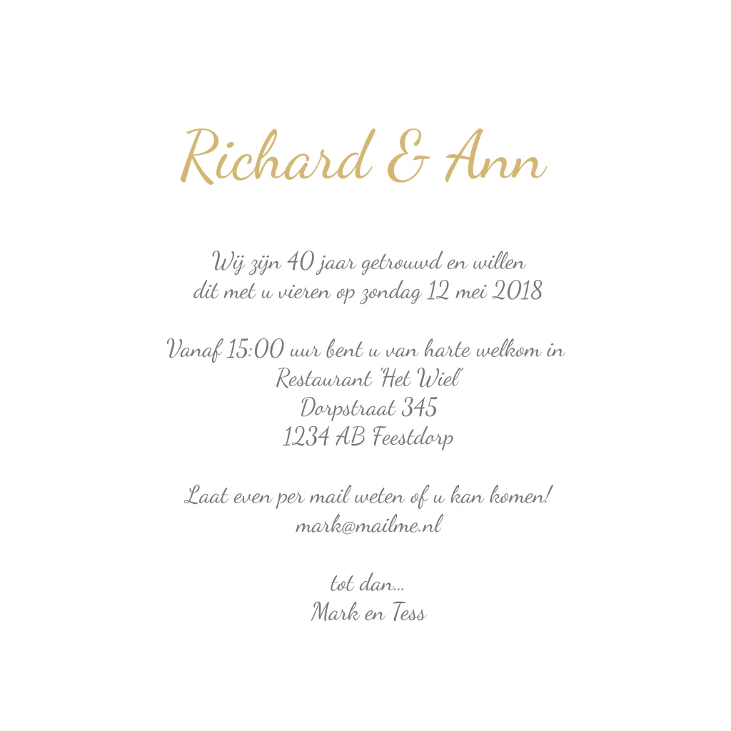 Of je nou 5, 10, 12-5, 25, 40, 50 of 60 jaar getrouwd bent deze uitnodiging is voor alle jubilea geschikt. Pas zelf de tekst aan op de voor- en binnenkant.