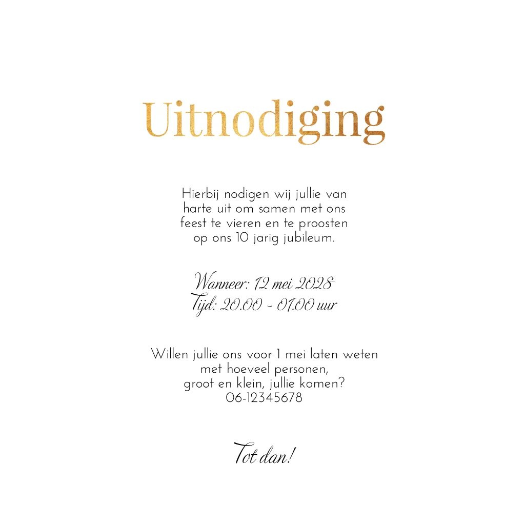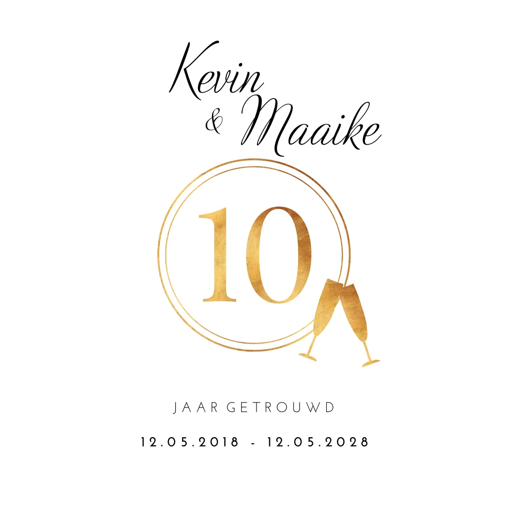 Mooie strakke uitnodiging voor een 10 jarig huwelijksjubileum. Grote tien met champagneglazen in goudlook op de voorkant. Pas de tekst gemakkelijk en geheel naar wens aan.