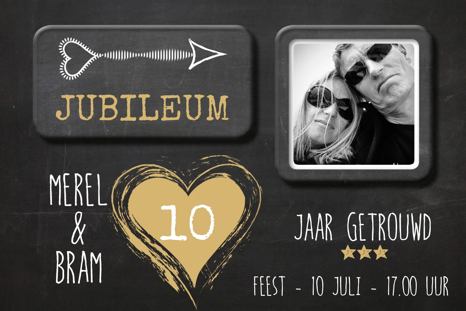 Hippe en eigentijdse uitnodiging voor jullie 10 jarig huwelijk. Versiert met een hart, pijl en sterren. Makkelijk te maken en aan te passen.