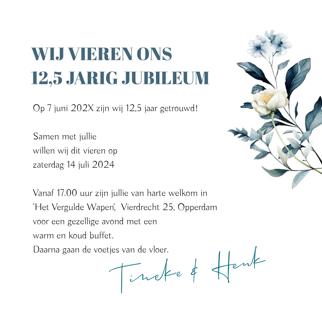 Vier 12,5 jaar samenzijn met deze prachtige jubileumuitnodiging Romantic Botanic Blue. Voeg eenvoudig een persoonlijke touch toe met jullie eigen foto's.