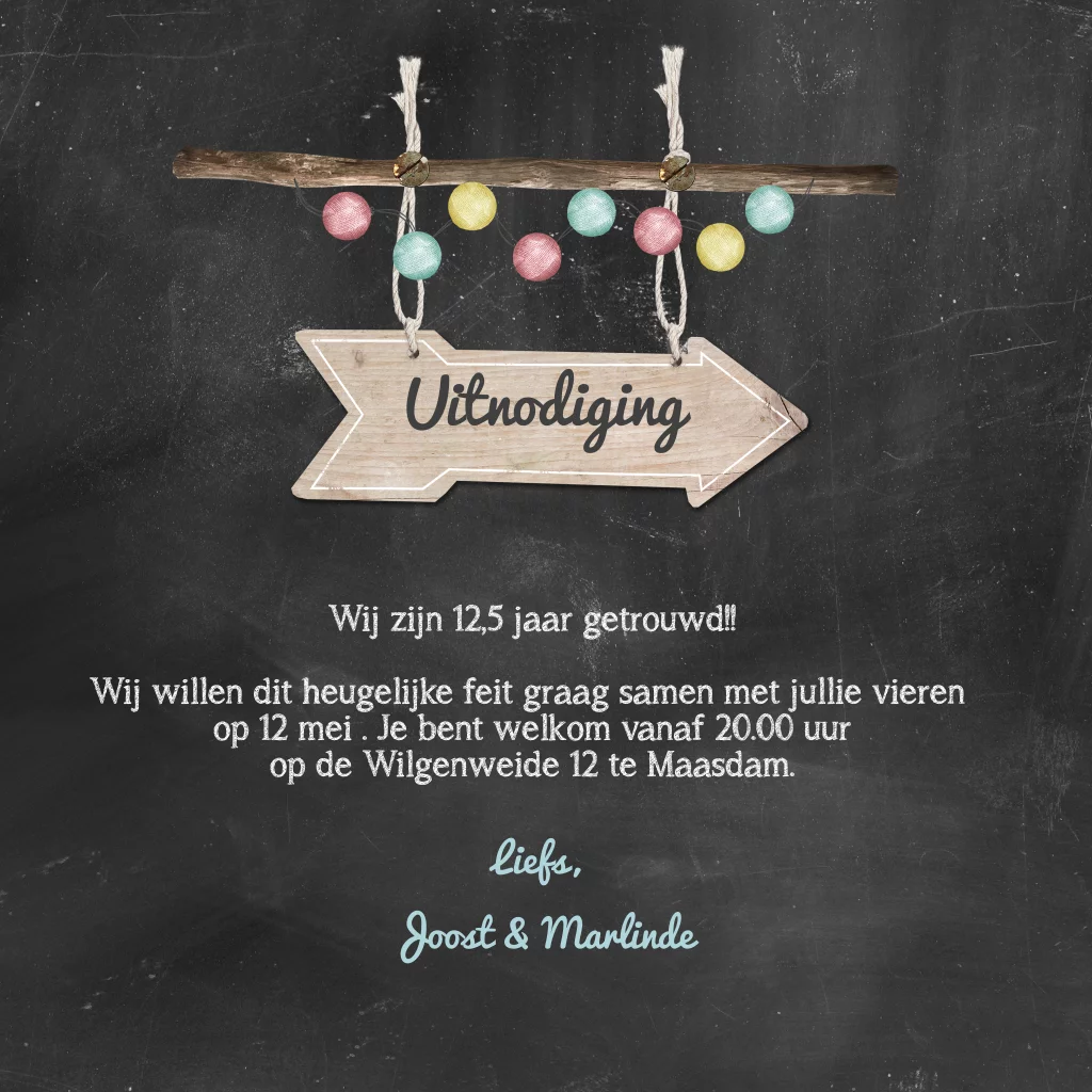 12,5 jarig huwelijksjubileum, gefeliciteerd! Nodig al jullie vrienden en familie uit met deze feestelijke kaart. Een vrolijke gekleurde lampionnen slinger op krijtbord met houten wegwijzer.