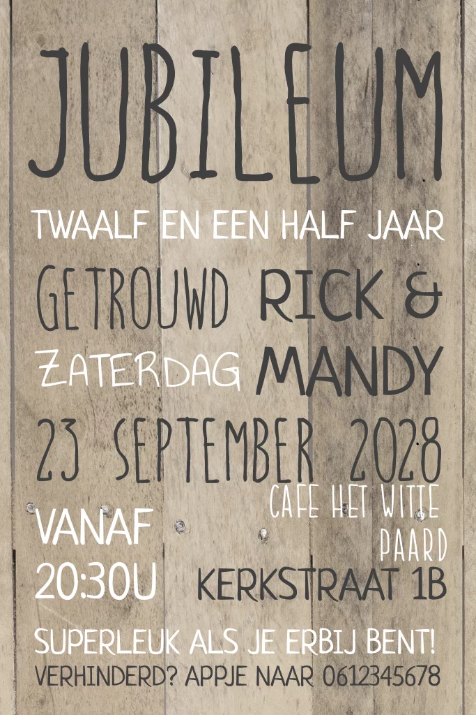 12,5 jaar getrouwd uitnodiging. Een simpele maar stoere uitnodiging. Lekker feestelijk door de verschillende lettertypes op een houten achtergrond.