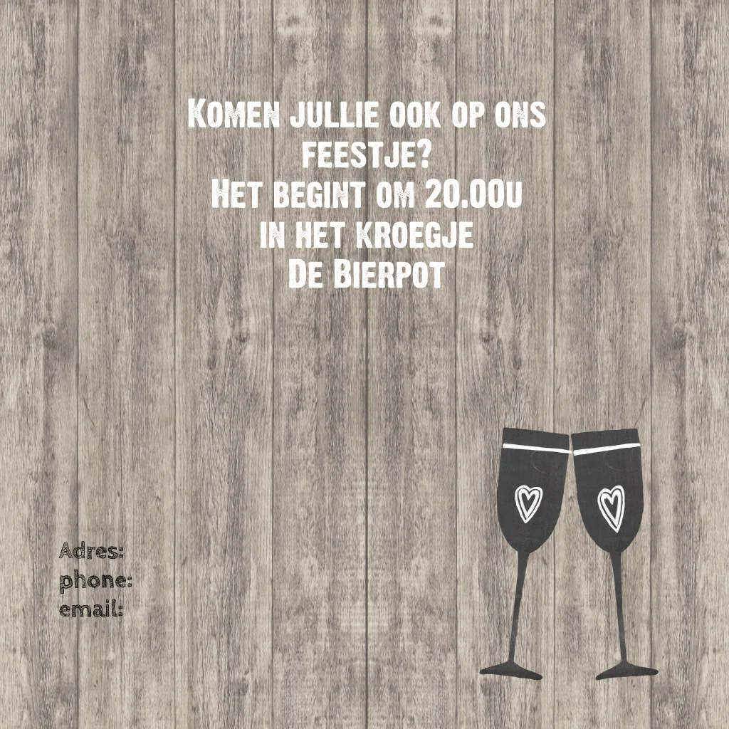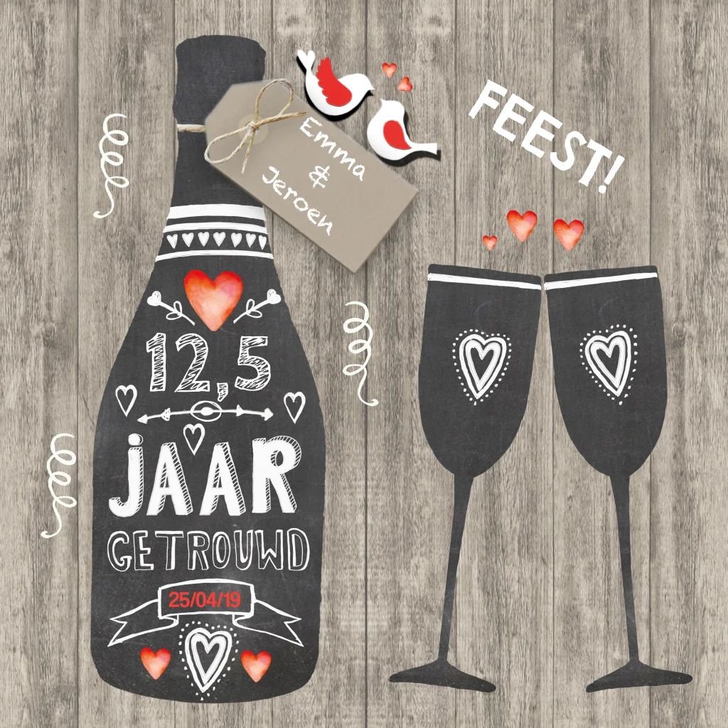 Uitnodiging huwelijksjubileum met fles en glazen als schoolbord en handlettering tekst versierd met label