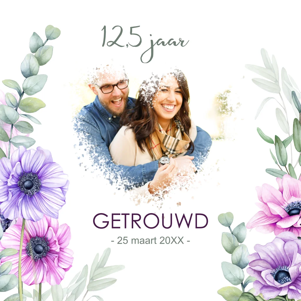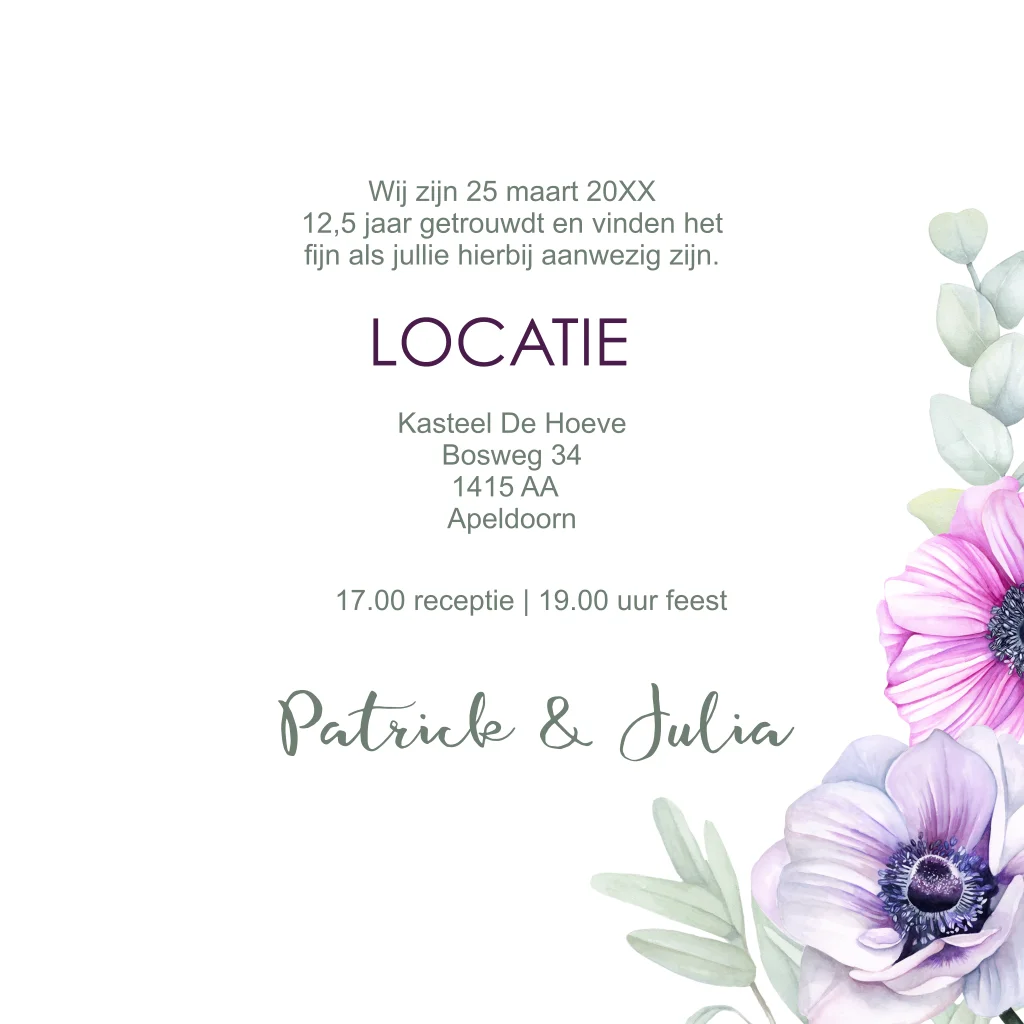 huwelijksjubileumuitnodiging met mooie anemonen en eucalyptusblad.