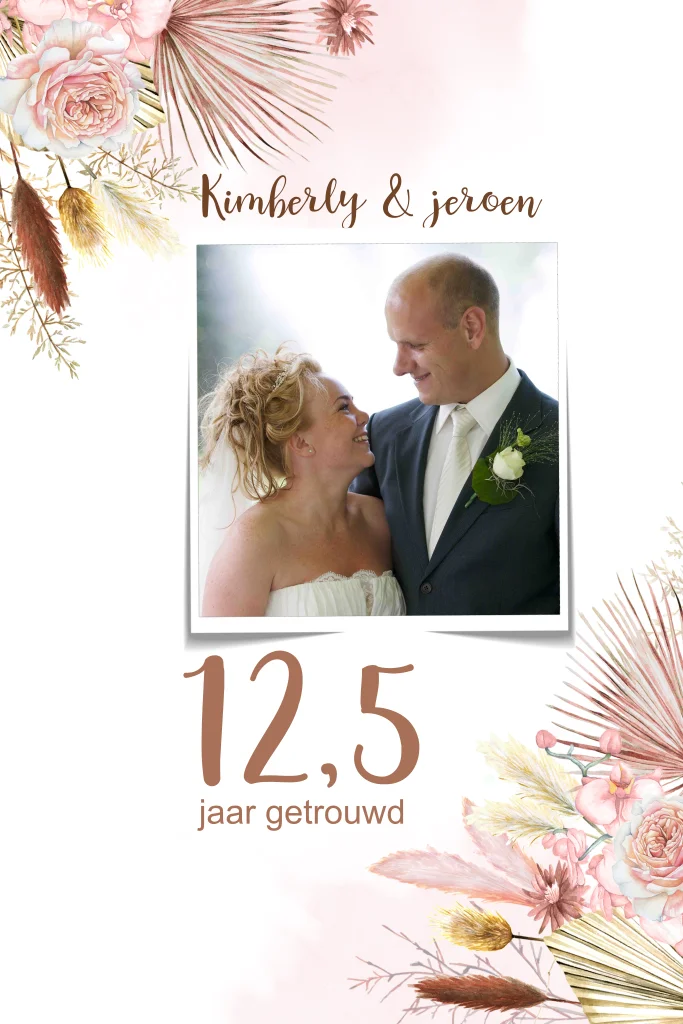 Huwelijksjubileum kaart met droogbloemen en rozen