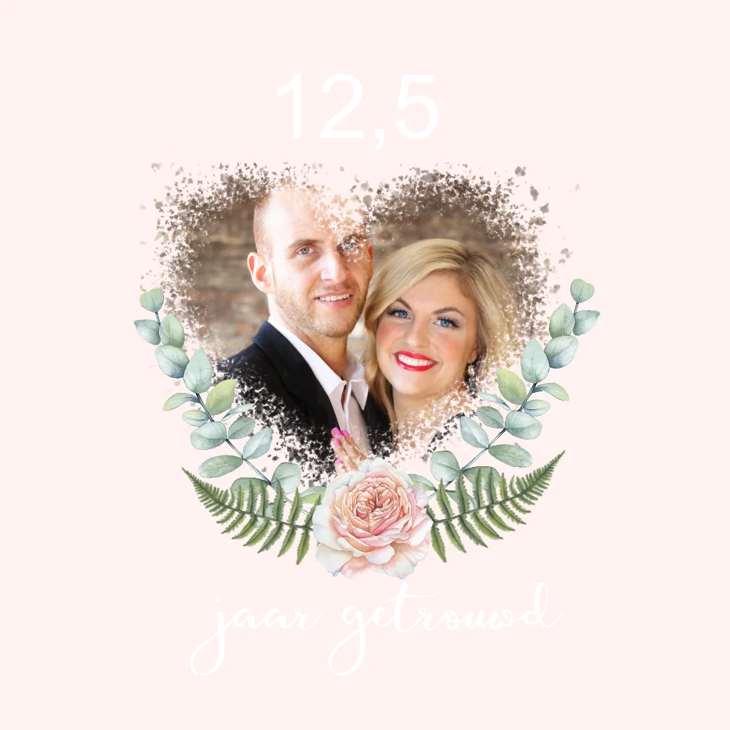 Uitnodiging huwelijksjubileum met eucalyptusblad, varenblad en roos en mooi hartkader voor jouw foto en echte folie