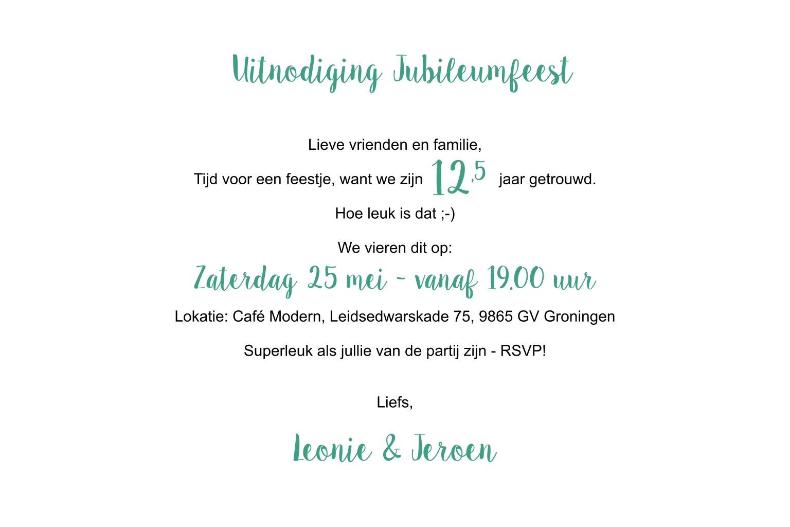 Vrolijke uitnodiging voor jullie 12,5 jarig jubileumFEEST. Met gouden ballonnen, botanisch blad en confetti. Plaats binnen jullie eigen foto.