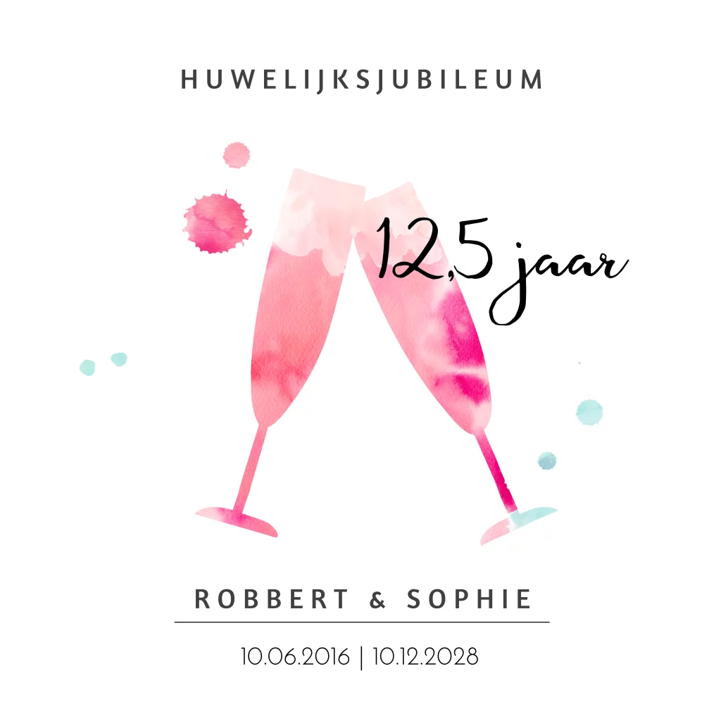 Proost! Vrolijke uitnodiging voor een 12,5 jarig huwelijksjubileum. Leuk afbeelding van roze watercolor champagneglazen. De tekst op de kaart is geheel naar wens aanpasbaar. Tip: deze kaart past goed bij een knalroze envelop.