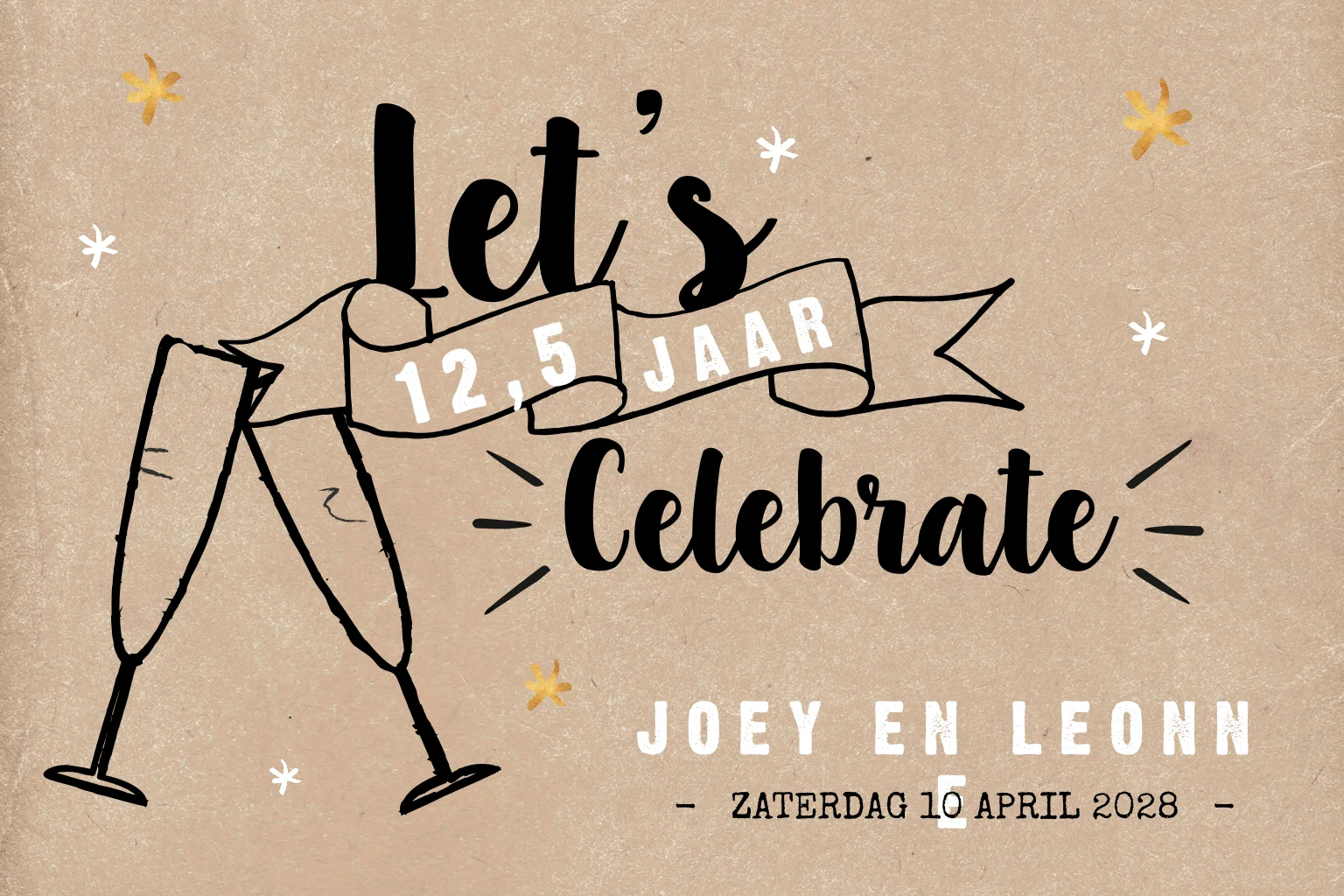12,5 jaar getrouwd! Maak je trouwdag extra feestelijk door de een deze hippe uitnodiging te versturen. Mooi met kraft achtergrond, champagneglazen en toffe handlettering. Mooi met de gouden sterren. Gaaf met een bijpassende envelop en sluitzegel!