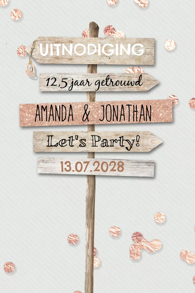 Feestelijke uitnodiging voor jullie 12,5 jarig huwelijksjubileum. Leuke wegwijzer met daarop verschillende vrolijke lettertypes en rosé gouden confetti. Maak het af door te kiezen voor een bijpassende kleur envelop.