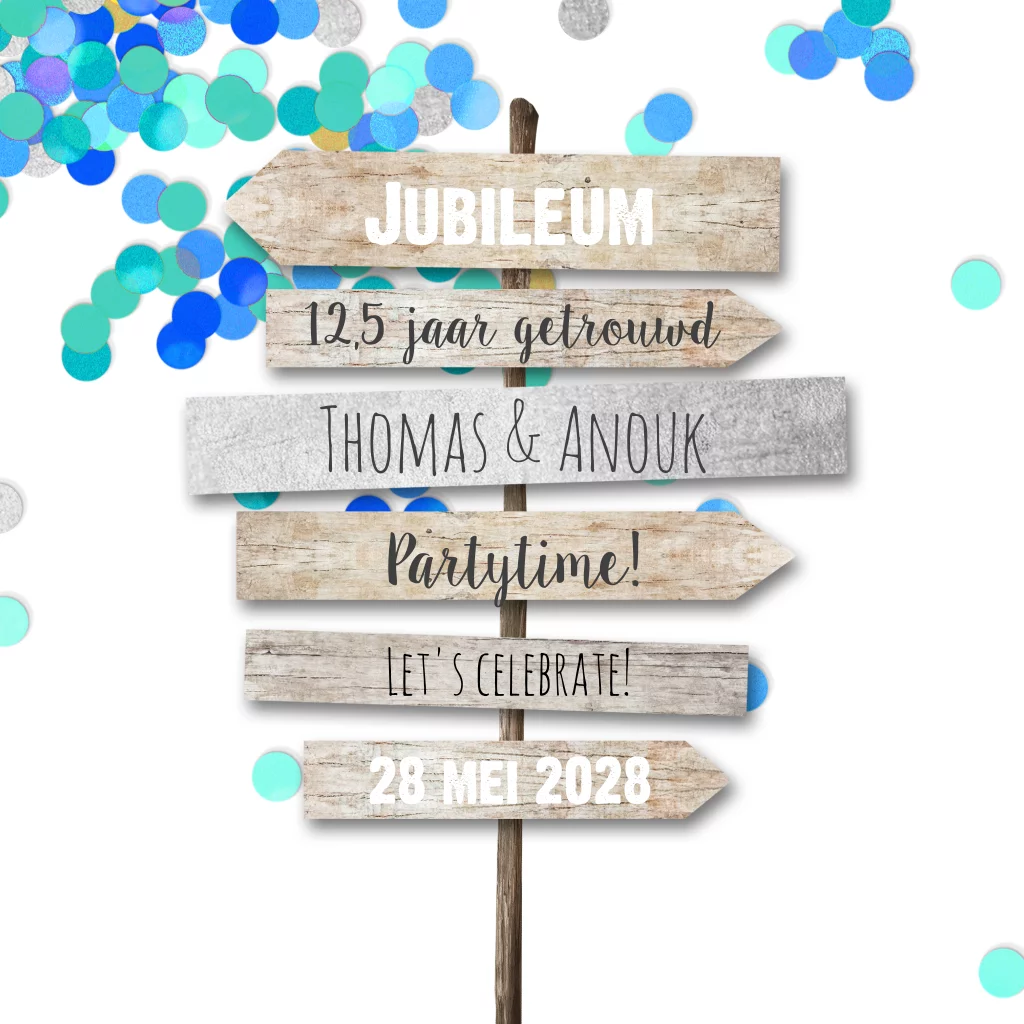 Vrolijke uitnodiging voor jullie 12,5 jarig huwelijksjubileum. Aan de binnenkant ruimte voor persoonlijke foto. Leuke wegwijzer met daarop verschillende vrolijke lettertypes en blauwe confetti. Maak het af door te kiezen voor een bijpassende kleur envelop.